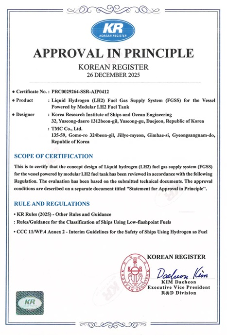지난 2025년 12월 26일, 당사가 개발한 '모듈형 액체수소 연료탱크를 적용한 선박용 액체수소 연료공급시스템(FGSS)' 기술이 한국선급(KR)으로부터 AIP(Approval in Principle) 를 획득했습니다.