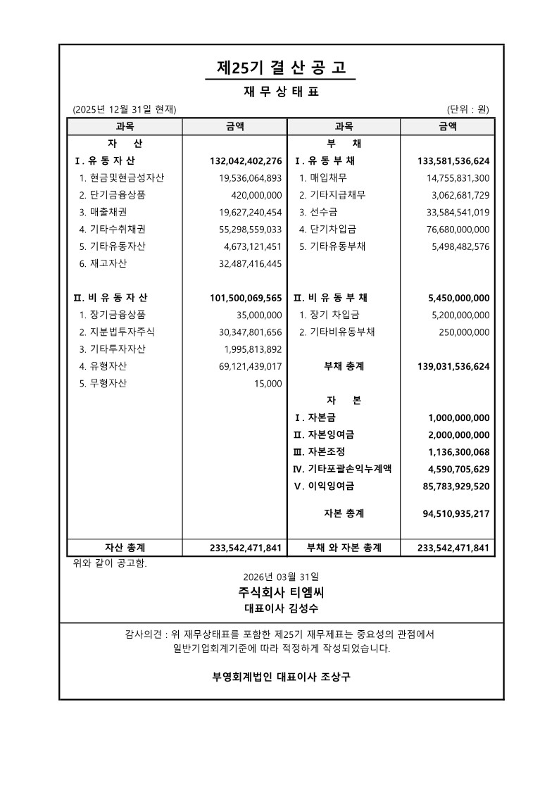 상법 제449조에 의거하여 당사의 제25기(2025년 1월 1일 ~ 2025년 12월 31일) 재무상태표를 아래와 같이 공고합니다.